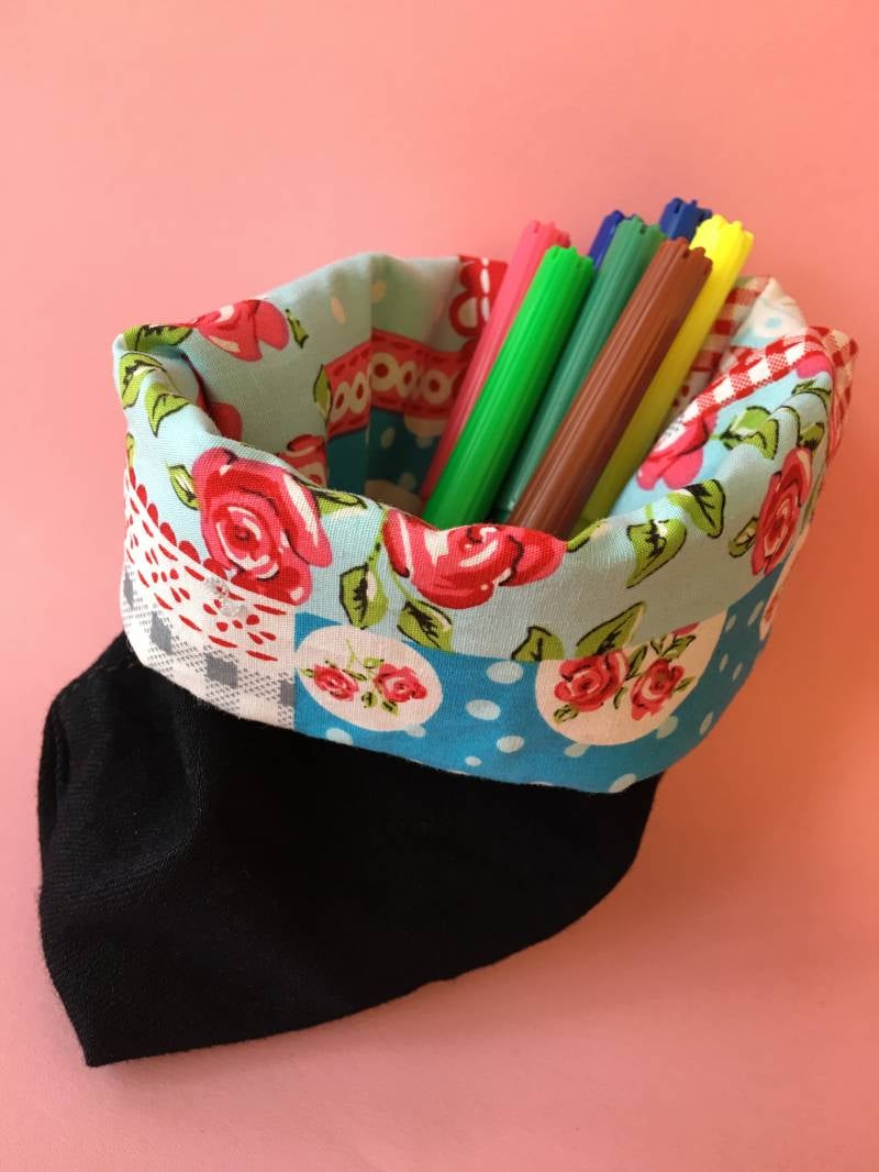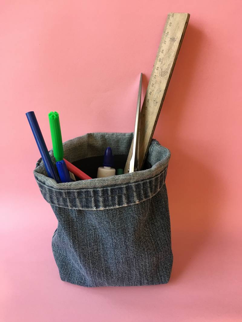 Hier ziet u een mandje dat gemaakt is van een oude spijkerbroek. Dit is heel handig om al u scharen, pennen, lijmpotjes enz. in te doen.