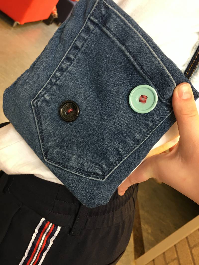 Dit tasje is gemaakt van een oude spijkerbroek. De binnenkant van dit tasje is gemaakt van een oud bloesje. We hebben ook nog wat knopen er op genaaid.