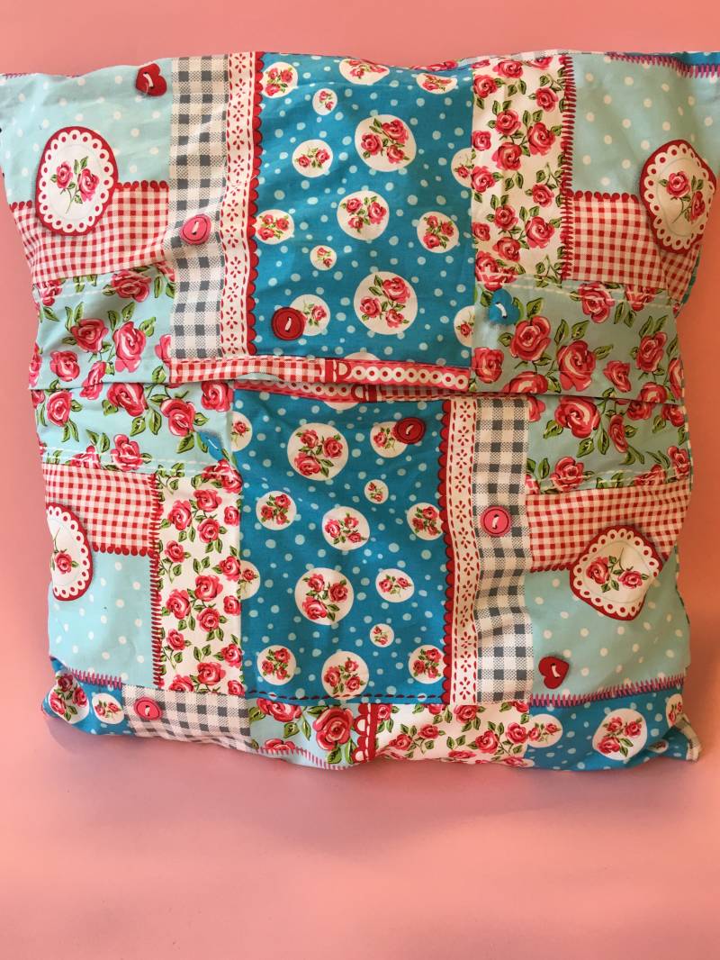 Dit is een zelfgemaakte kussensloop. Hij heeft twee kanten. De ene met bloemetjes en de andere kant met sterren. Bij de bloemetjes is die kant open om je kussen erin te doen. Je kan zelf kiezen welk kussen je erin wilt doen.